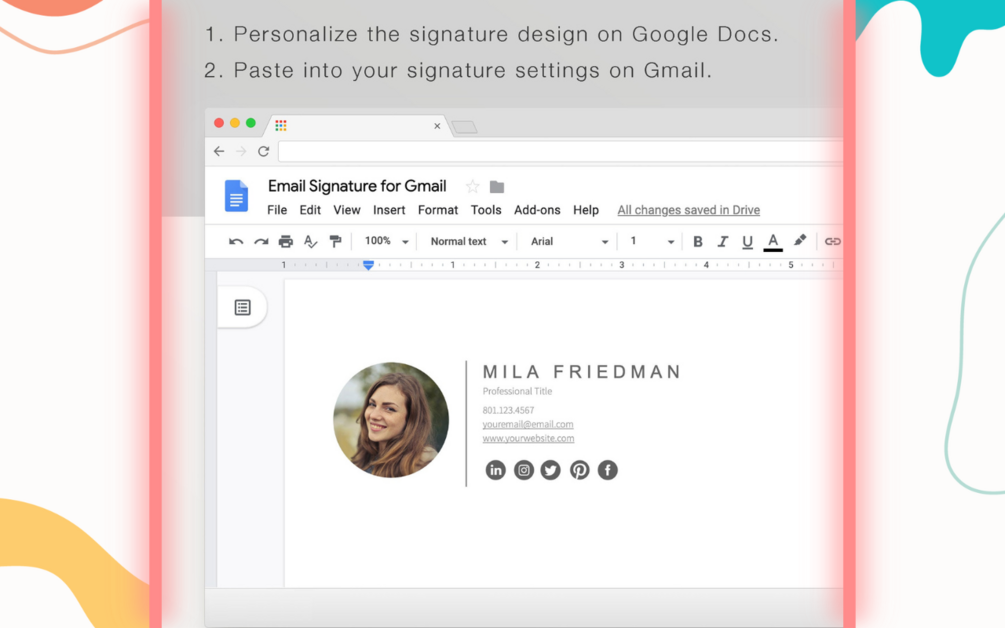 Gmail Email Signature Template. A customizable modern email signature template for Gmail with clickable social media links.