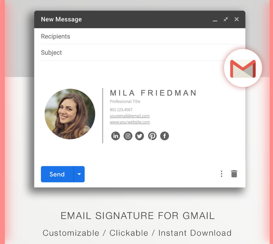 This Gmail email signature template is professionally designed to look modern, simple, clean, and professional. You can easily edit everything you see in the template. It's rather simple to update your Gmail signature with this template and stand out of the crowd in minutes. Every time you compose a new email in Gmail the signature will conveniently appear at the bottom of your message.